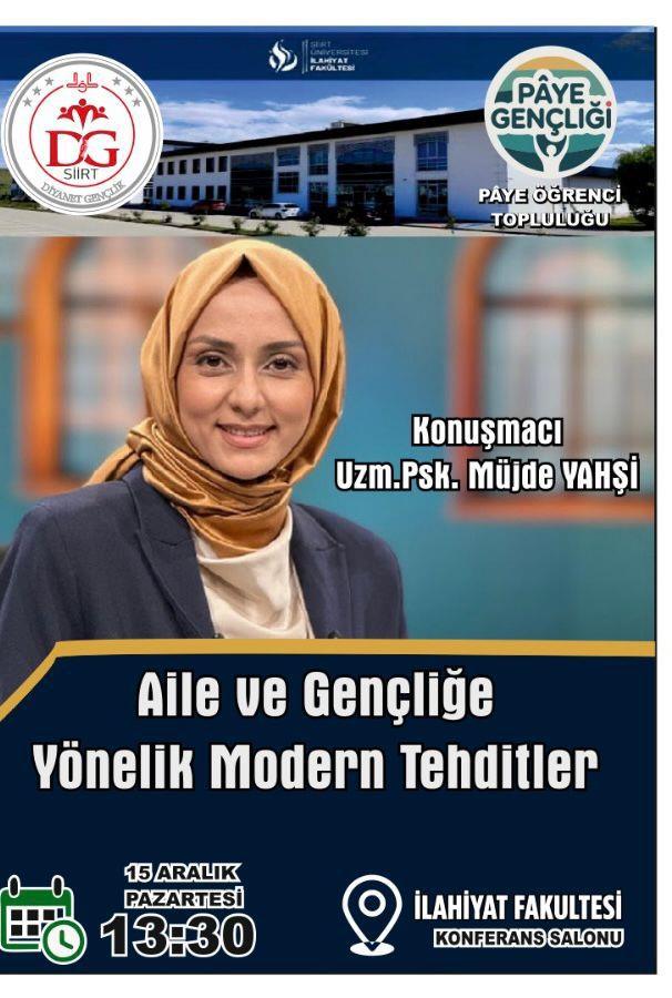 Siirt Üniversitesi İlahiyat Fakültesi, Pâye Öğrenci Topluluğu’nun organizasyonu ile aile ve gençlik alanındaki nitelikli çalışmalarıyla tanınan Uzman Psikolog Müjde Yahşi’yi konuk ediyor.