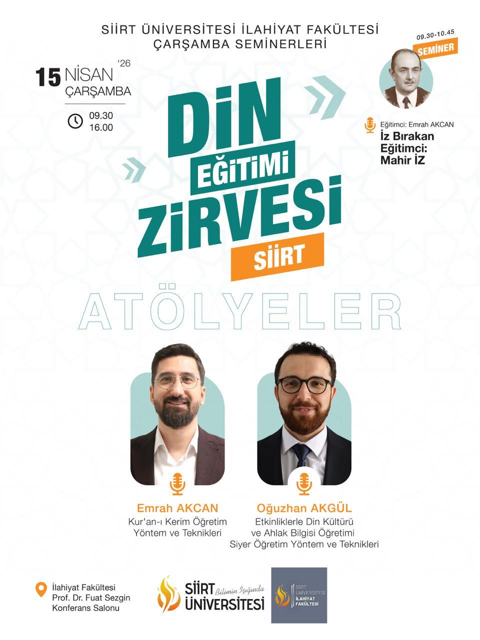 Siirt Üniversitesi İlahiyat Fakültesi, Çarşamba Seminerleri kapsamında önemli bir akademik etkinliğe ev sahipliği yapmaya hazırlanıyor. “Din Eğitimi Zirvesi” başlığıyla düzenlenecek konferanslar serisi, 15 Nisan 2026 Çarşamba günü 08:30–17:00 saatleri arasında gerçekleştirilecek.