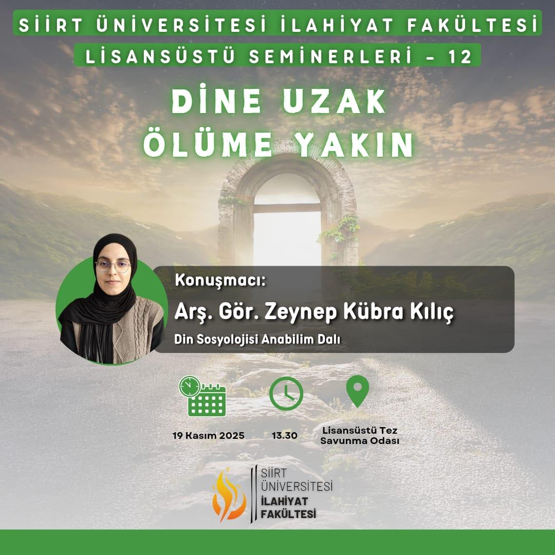 Fakültemizde Arş. Gör. Zeynep Kübra Kılıç tarafından “Dine Uzak Ölüme Yakın” başlıklı lisansüstü seminer, 19 Kasım Çarşamba günü saat 13:30’da Lisansüstü Tez Savunma Odasında gerçekleştirilecektir.